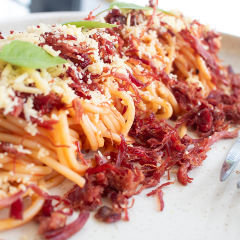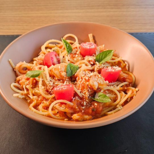 Espaguete ao sugo com camarões refogados no azeite e um toque de manjericão
