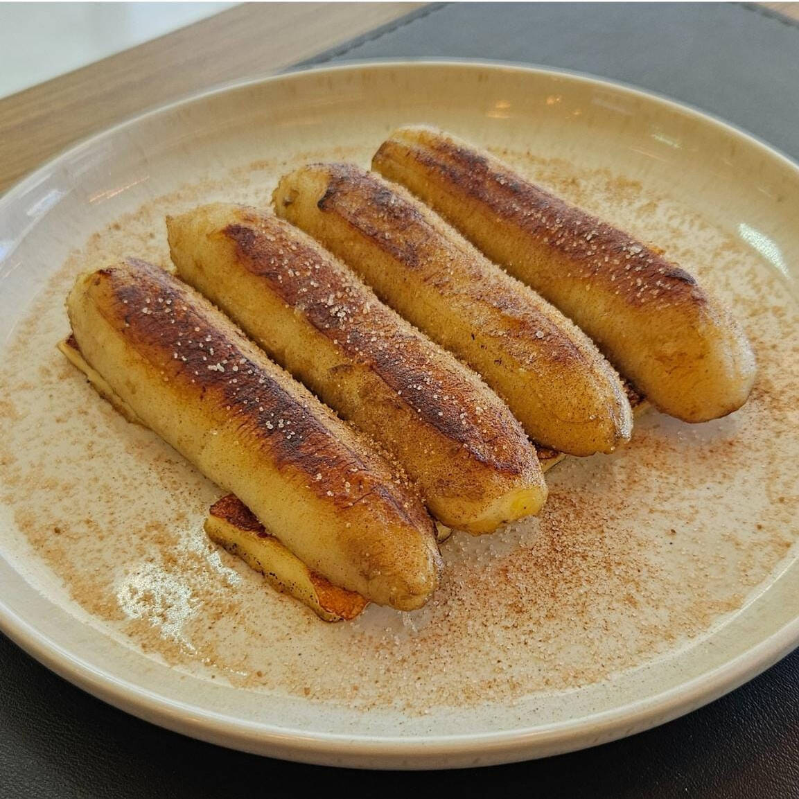 Receita tradicional nordestina. Banana prata assada coberta com queijo manteiga na chapa, polvilhado com açucar e canela