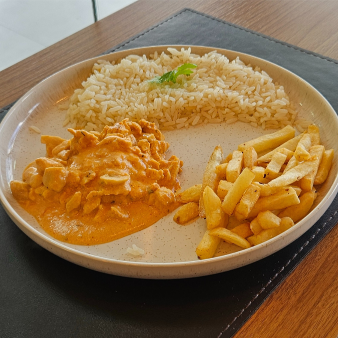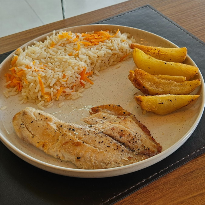 Acompanhado de arroz refogado, batata rústica e mini salada com molho da casa.