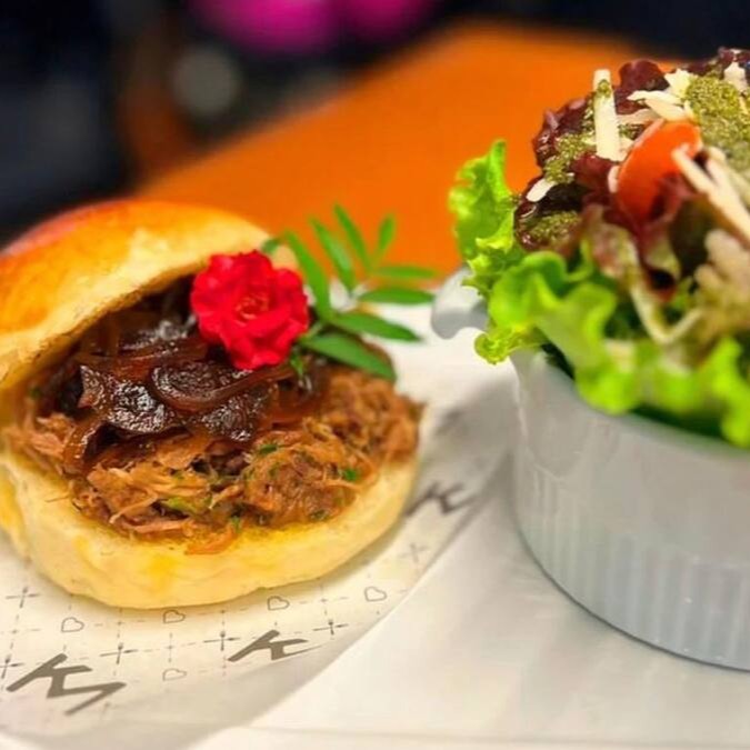 Costela cozida em em fogo lento, pão artesanal, cebola caramelizada. Acompanha molho bechamel e salada da casa.