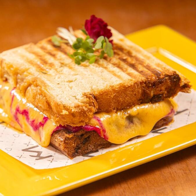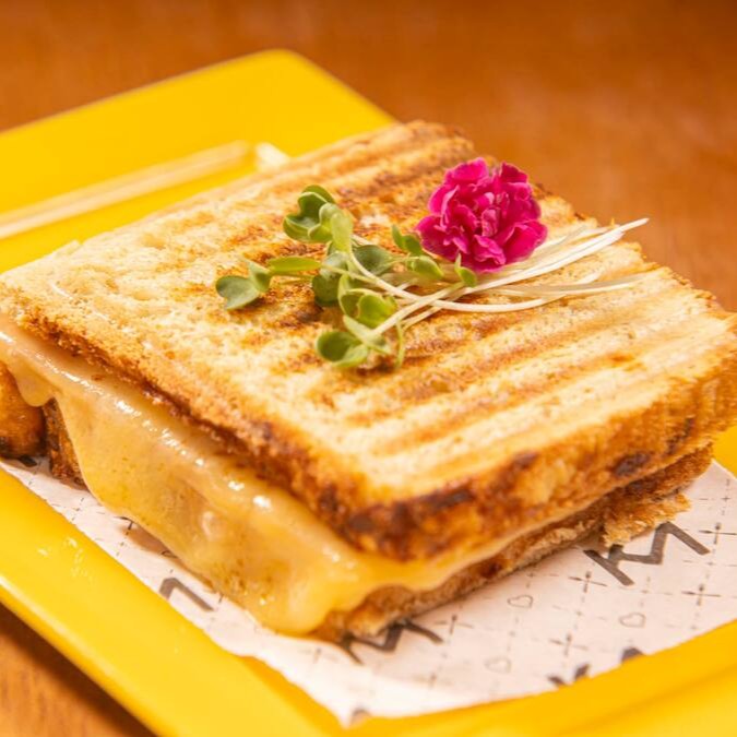 Fatias de pão artesanal, queijo mussarela, presunto peito de peru e molho bechamel.