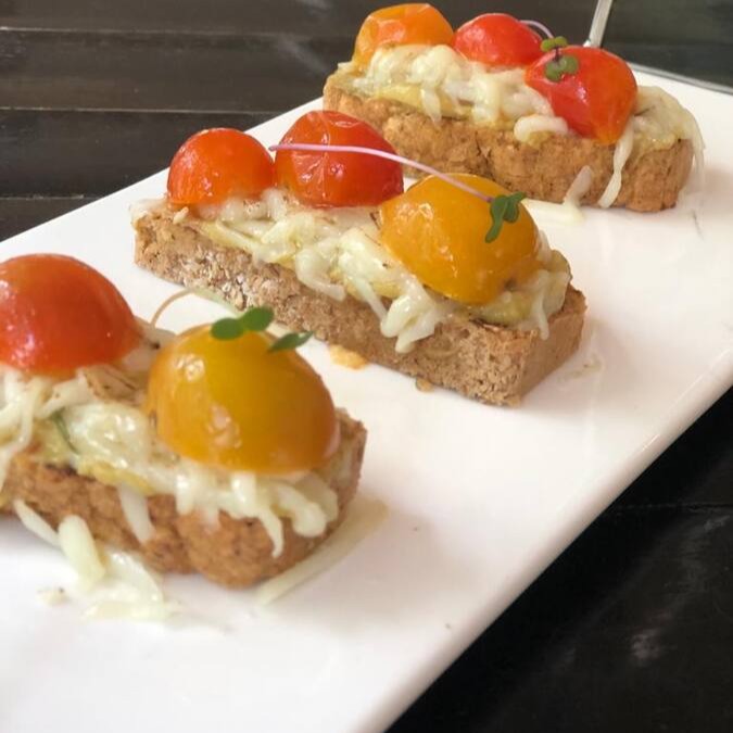 Fatias de pão da casa, creme de abacate levemente picante, mussarela de búfala e tomates confit.