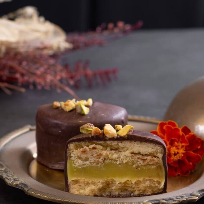 Massa de biscoito sucrê, com brigadeiro de pistache, banhado no chocolate ao leite.