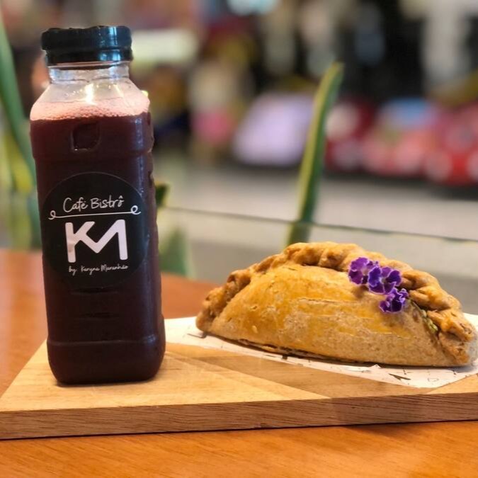 Empanada argentina integral de frango, acompanha chá de Hibisco da casa com frutas vermelhas, gengibre e um leve toque mel orgânico.