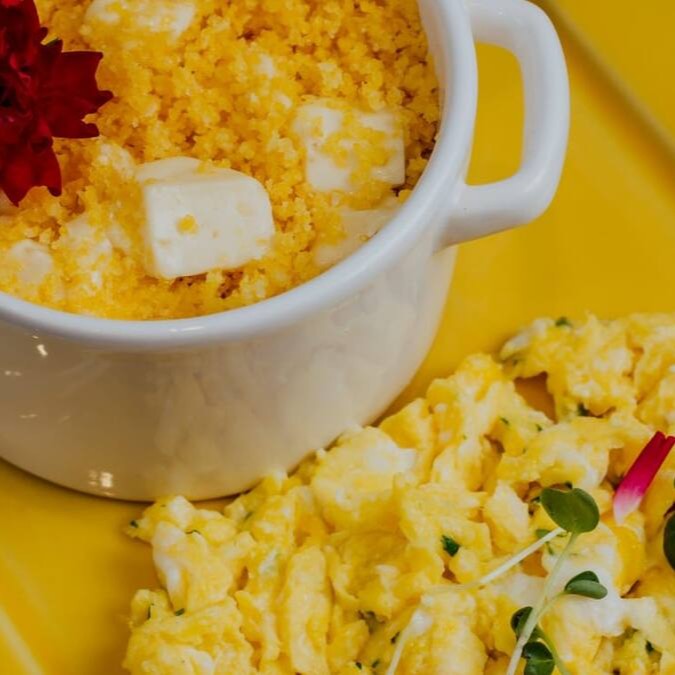 Com cubos de queijo coalho e renda para finalizar. Acompanha ovo com gema mole ao molho bechamel.