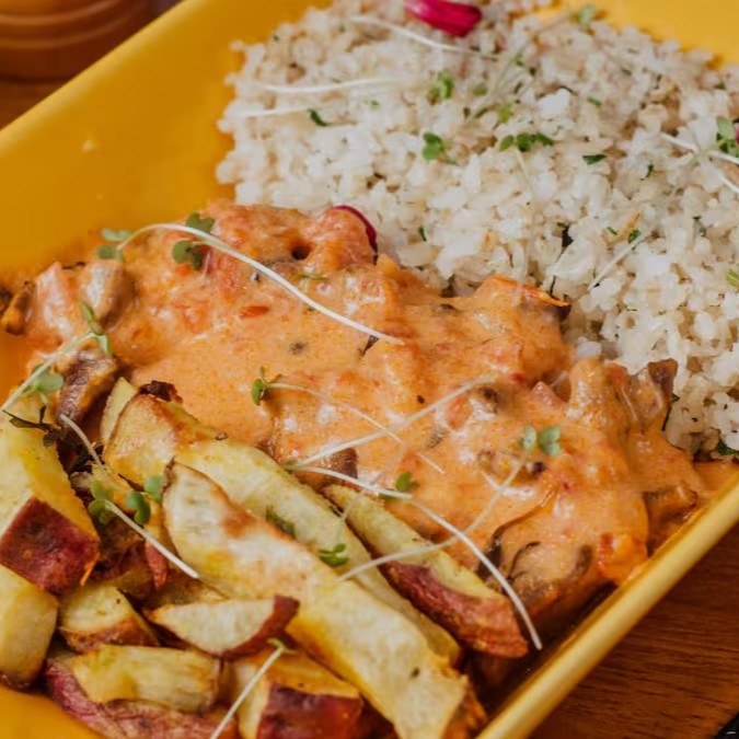 Estrogonofe de frango fit, arroz integral e batata doce assada.