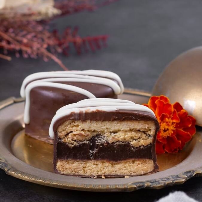 Biscoito banhado de chocolate ao leite com recheio de brigadeiro.