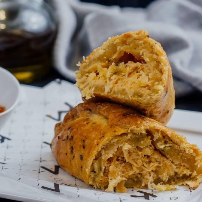 Empanada de frango, com Catupiry e azeitonas verdes.