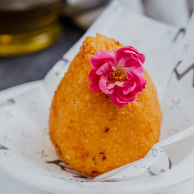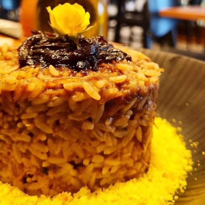 Arroz caldoso, costela feita em fogo lento, finalizado com panko crocante.
