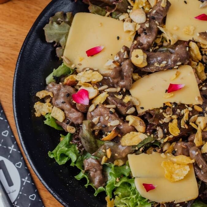 Mix de folhas, lascas bovina grelhada, parmesão ralado, cebolas caramelizadas e lascas de amêndoas. Acompanha mostarda e mel.