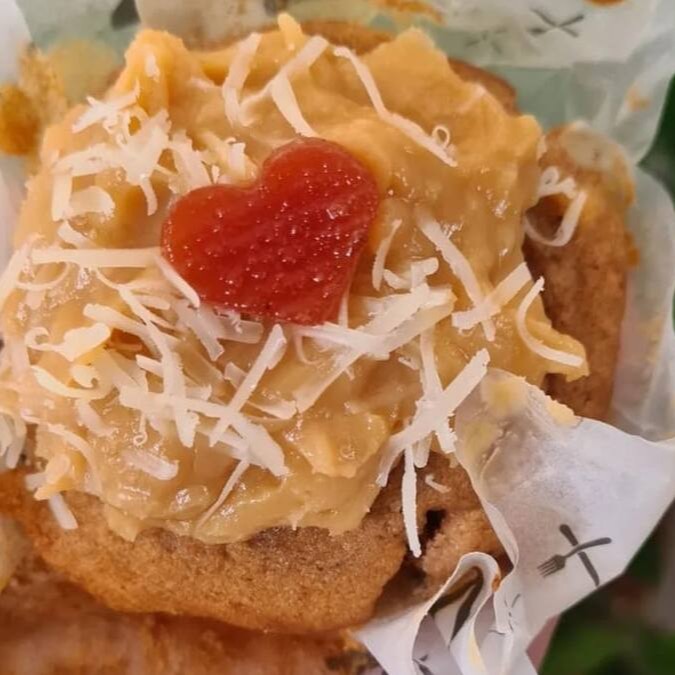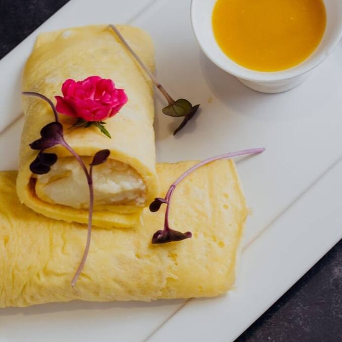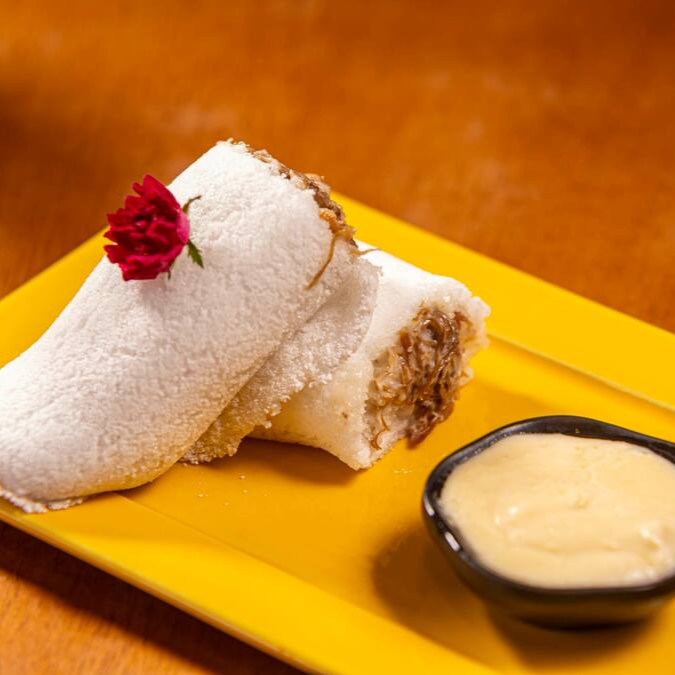 Recheada com coco fresco, envolvido com queijo coalho, acompanha mel orgânico.