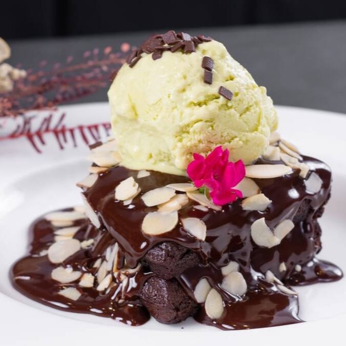 Bolo Brownie 100% cacau com brigadeiro de pistache