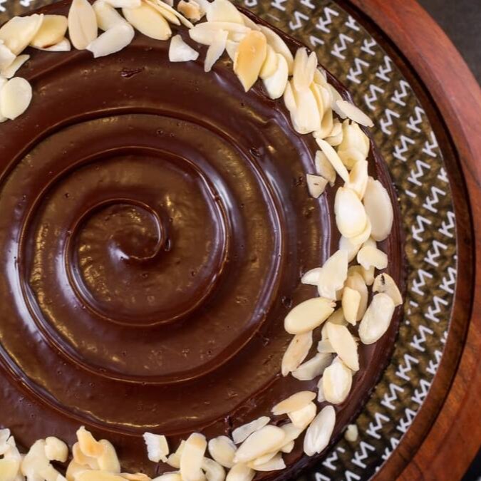 Bolo funcional de cacau 100%, Óleo vegetal, açúcar demerara, sem farinha, ganache de chocolate e laminas de amêndoas. Sem Glutén e sem Lactose.
