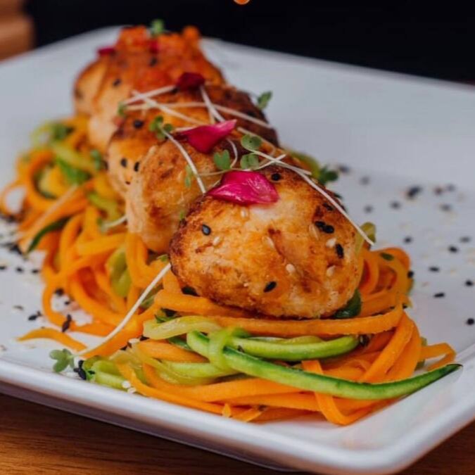 Espaguete de legumes salteados no azeite, bolinhas de frango, ricota fresca e chia.