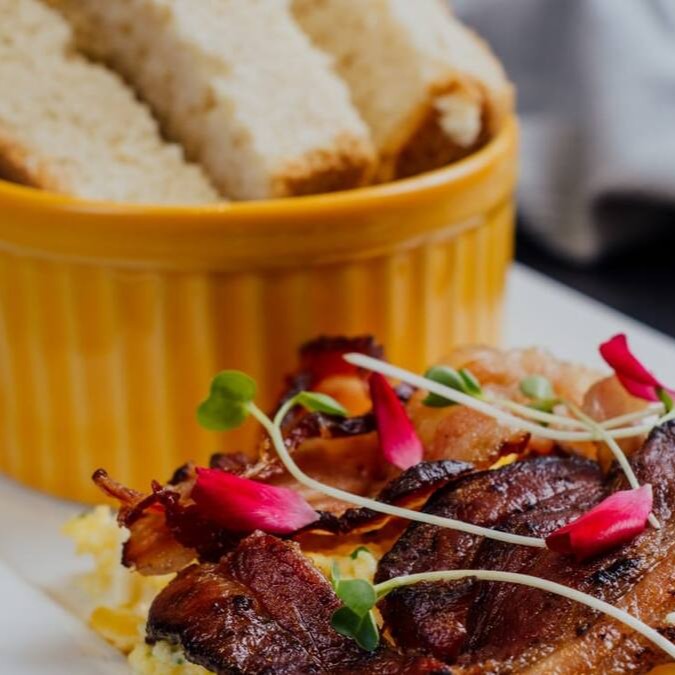 Ovos mexidos com bacon. Acompanha pão da casa.