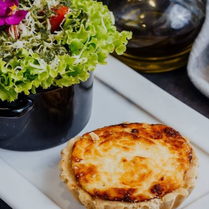Quiche de queijo prima donna, acompanha mini saladinha.