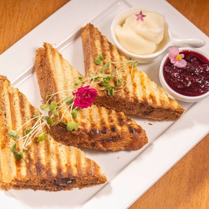 Pão da casa tostado na chapa com requeijão, acompanha geleia de frutas vermelhas da casa.
