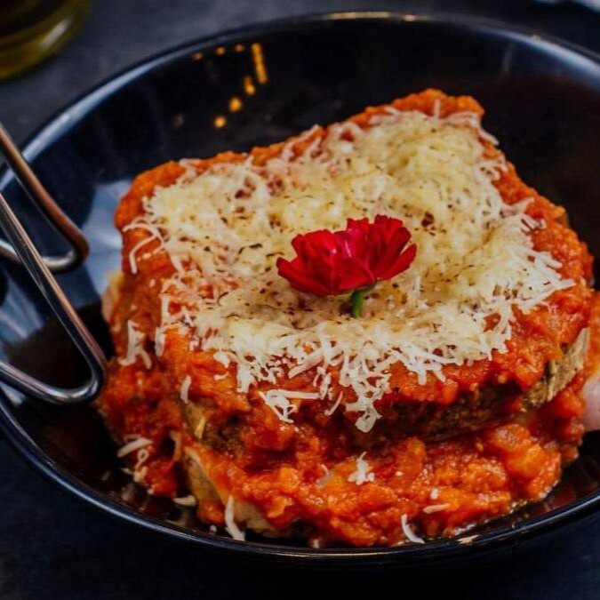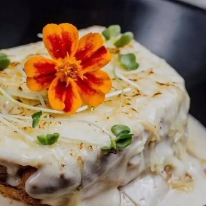 Isca de came com fettuccine na manteiga, lascas de queijo parmesão maçaricado, finalizado com molho roti e bechamel.