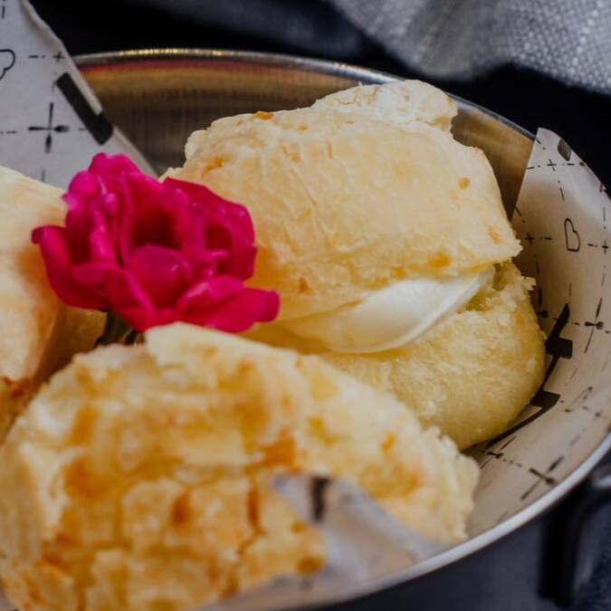 Pão de queijo da casa recheado com Cream Cheese.