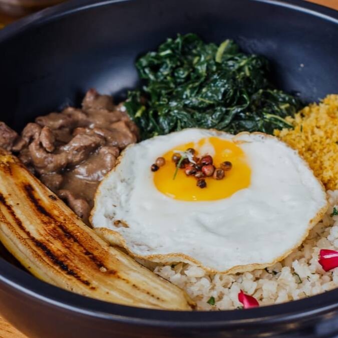 Iscas bovina, acompanha arroz integral, couve, banana prata assada e ovo.