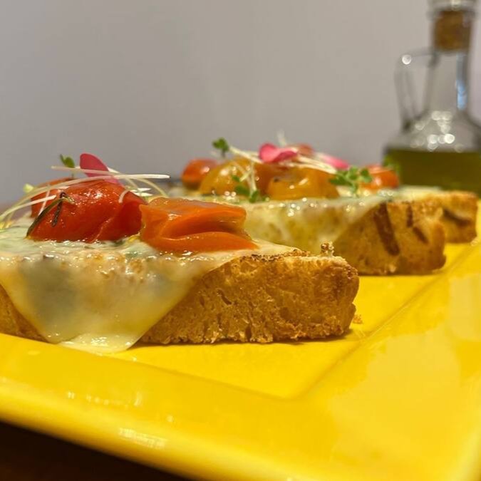 Fatias de pão da casa, caprese, mussarela de búfala,tomatinhos confit e molho pesto.
