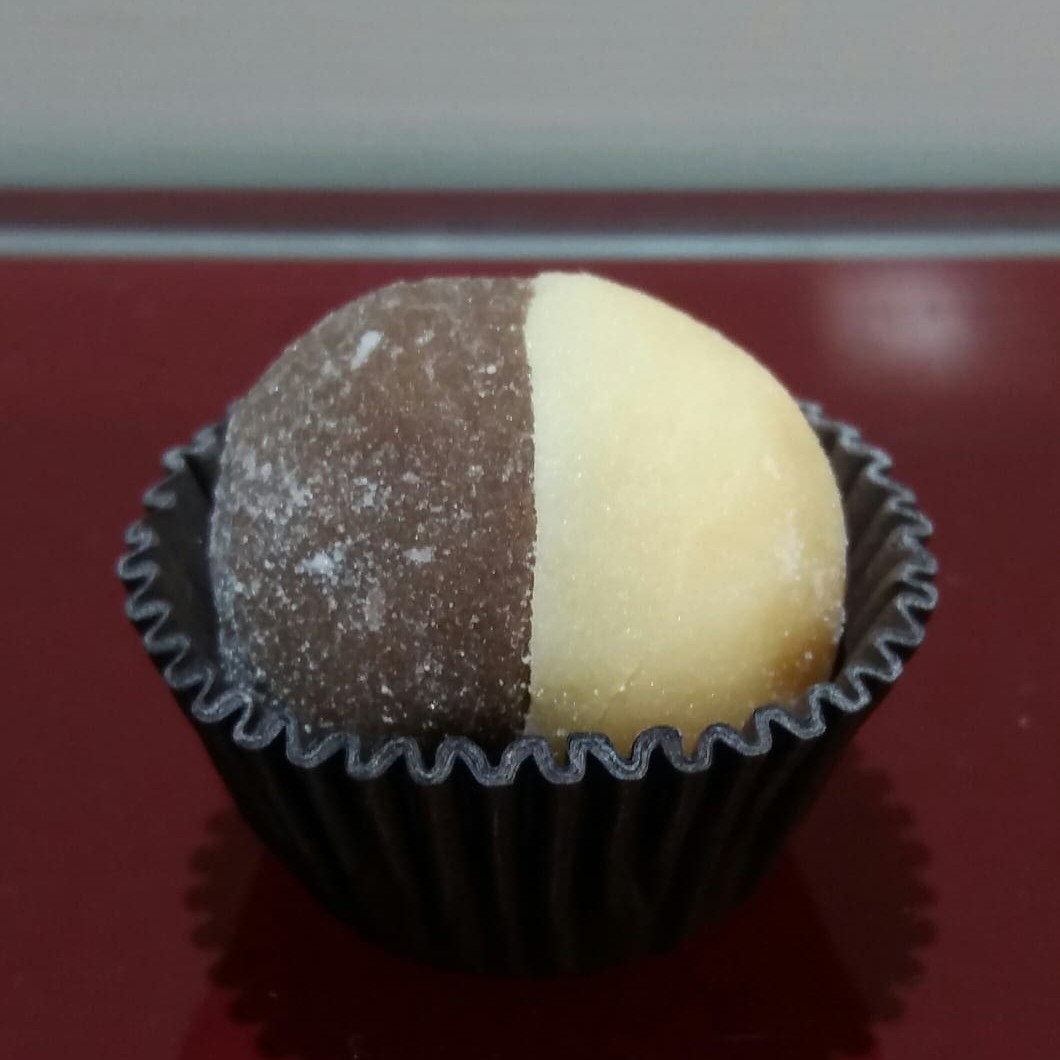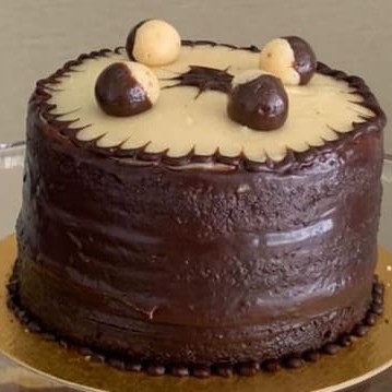 1kg Torta de Bem Casado, com saborosa massa tradicional de chocolate, duas camadas de recheio e cobertura de creme paris de chocolate com detalhes de brigadeiro branco e preto.