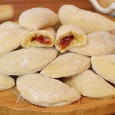 Saco contendo 25 unidades congeladas de delícia de queijo com presunto, com peso total de 550g. Esse salgado é preparado de forma artesanal, sua massa fica crocante por fora e macia por dentro e seu recheio acompanha queijo mussarela e presunto, com pequeno toque de orégano.