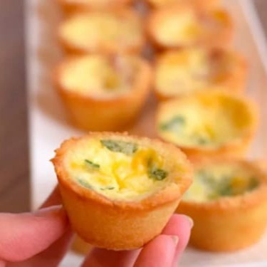 10 Mini Quiches cada uma c/ 15g: opções de recheio: queijo do reino, provolone, alho poró, tomate seco e charque.