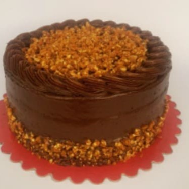 1kg torta de crocante com brigadeiro, massa de chocolate, recheio de brigadeiro com crocante e cobertura de creme paris de chocolate com detalhes de crocante.