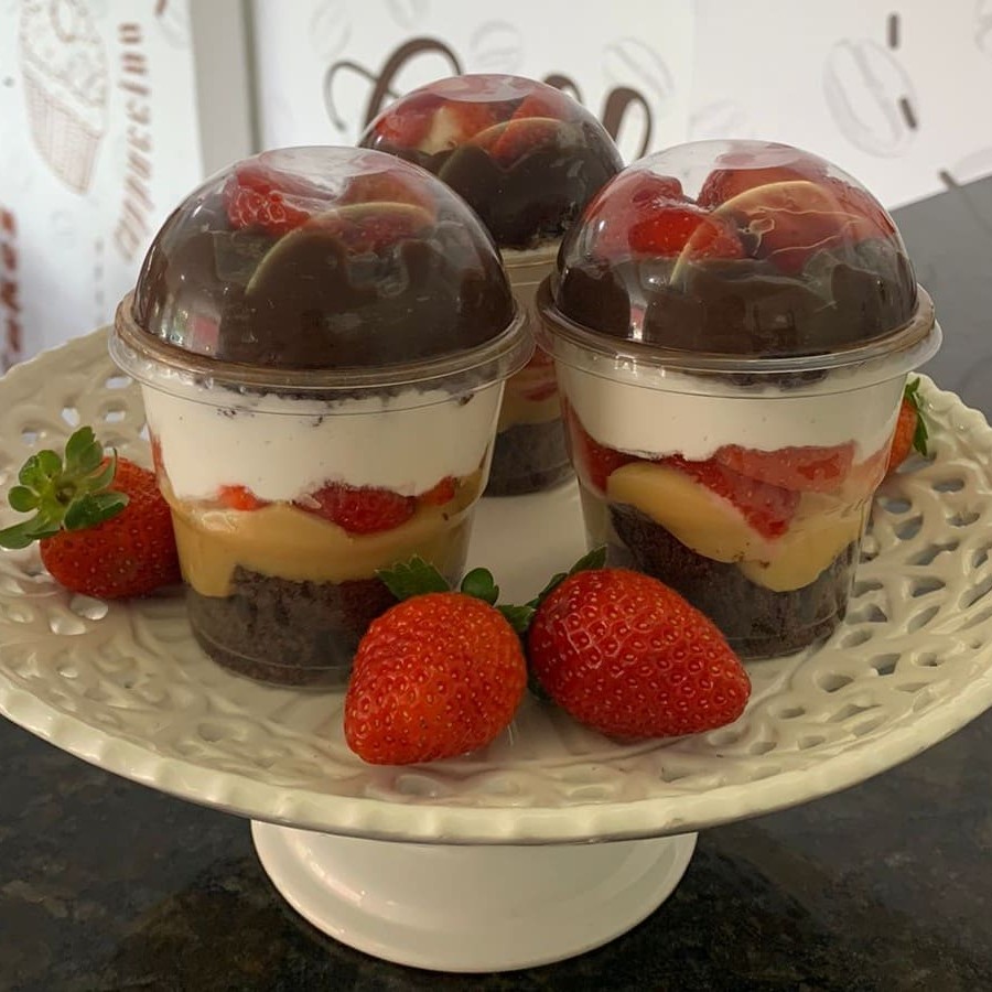 Bolo no pote de morango, com massa de chocolate e recheio de brigadeiro branco com morango fresco e chantilly, pesando 200g