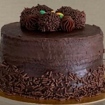 1kg Torta de brigadeiro, com saborosa massa tradicional de chocolate, duas camadas de recheio e cobertura de creme paris de chocolate com detalhes de brigadeiro.