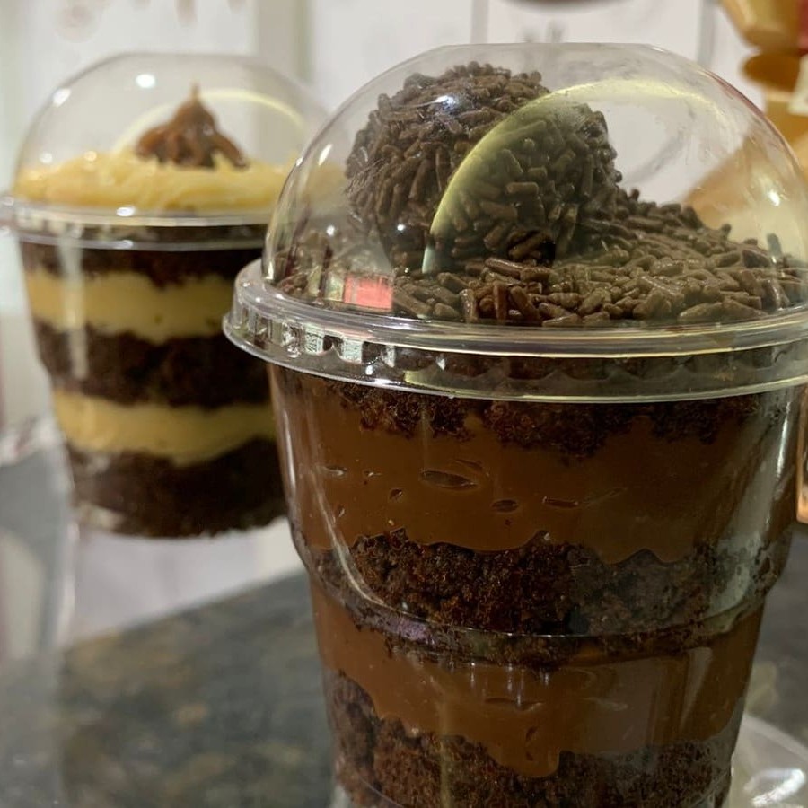 Bolo no pote de brigadeiro, com massa de chocolate e recheio de brigadeiro, pesando 200g