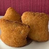 10 Mini croquetes de charque refolgado com queijo, pesando cada um aproximadamente 23g. Salgado frito na hora do pedido.