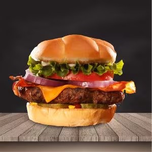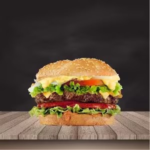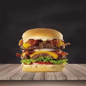 Pão bola, 2 hambúrgueres, ovo, bacon, queijo, presunto, cebola ao shoyu, salada e molho especial