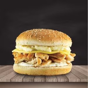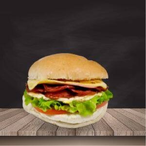 Pão bola, filé de frango, bacon, queijo, presunto, cebola ao shoyu, salada e molho especial