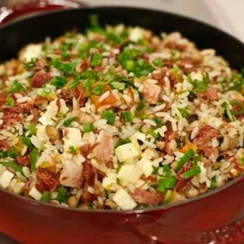 Feijão caseiro, espaguete, arroz, farofa matuta, jerimum e vinagrete.