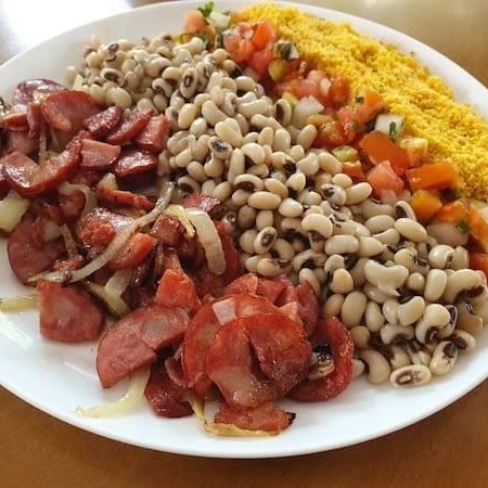 Acompanha feijão macassar, arroz, vinagrete e farofa