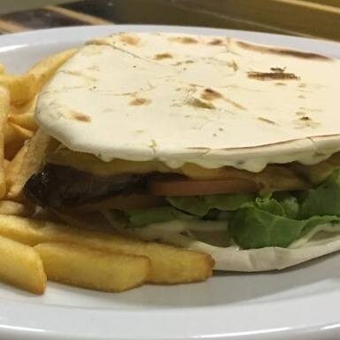 Pão sírio , picanha nacional cortadinha , queijo prato , tomate , alface e maionese verde. Acompanha batata frita.