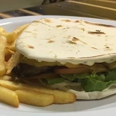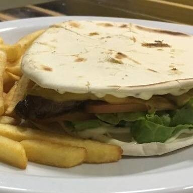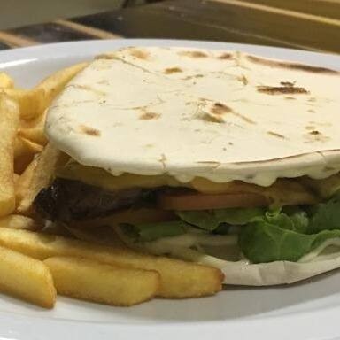 Pão sírio , carne bovina cortado em cubos , queijo prato , tomate , alface e maionese verde. Acompanha batata frita.
