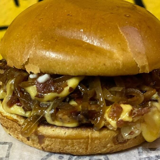 Pão tipo brioche, hambúrguer artesanal 80g, queijo prato, bacon, cebola ao m.shoyu e maionese da casa .