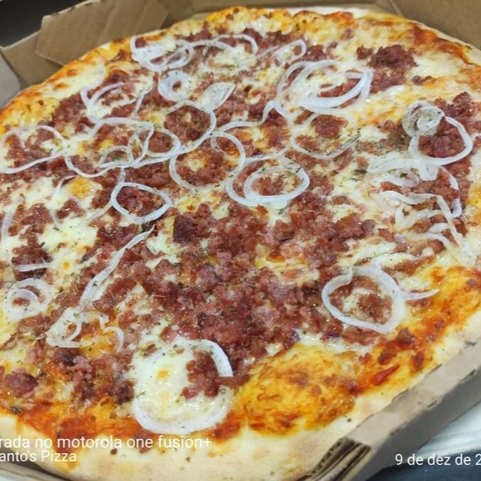 Molho, mussarela, calabresa, cebola, azeitona e orégano.