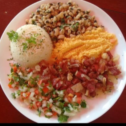 Arrumadinho De Charque Acebolada,arroz, Vinagrete E Farofa.