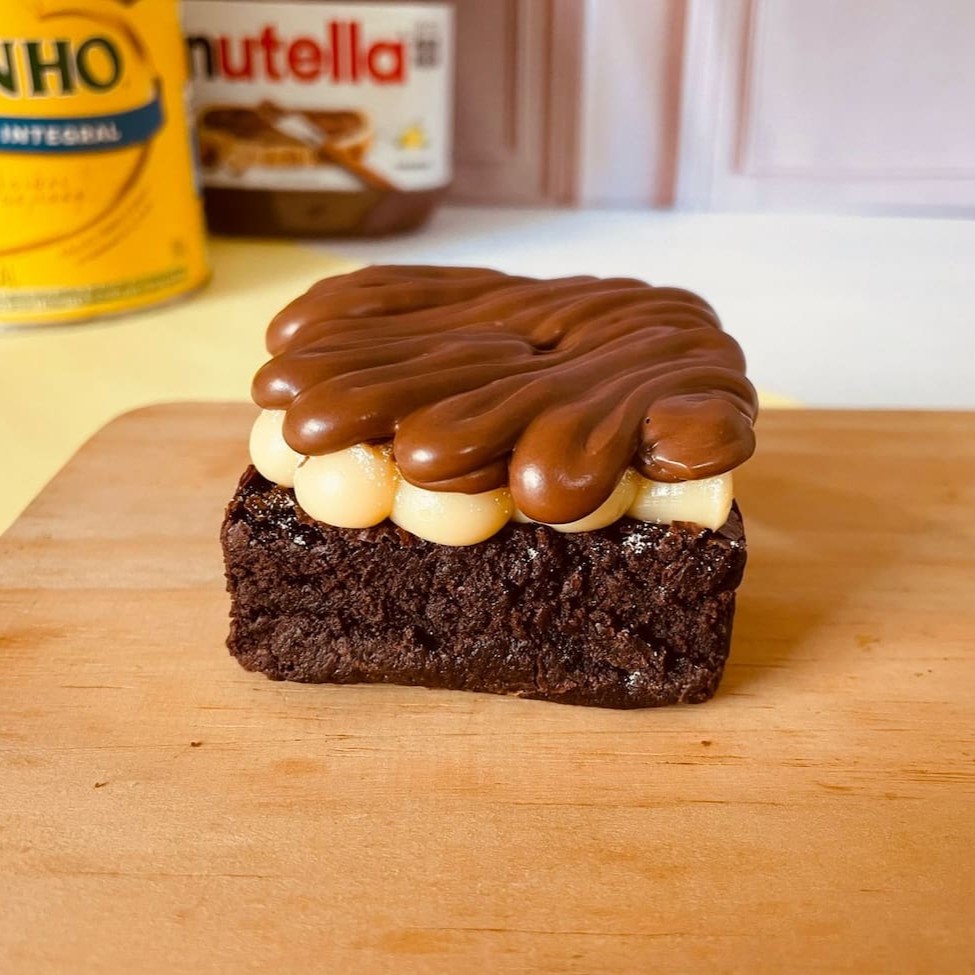 Nosso clássico, viciante e delicioso brownie de chocolate meio amargo, com cobertura de brigadeiro branco super cremoso, polvilhado com bastante leite Ninho e coberto com a queridinha Nutella. * Para os fãs da dupla Ninho com Nutella :)