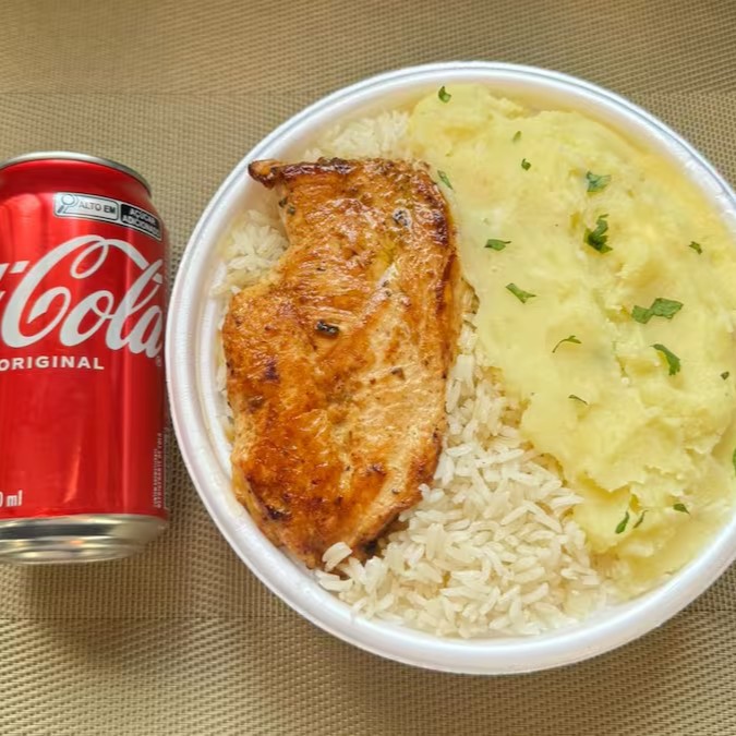 Marmita com delicioso filé de frango grelhado acompanhado de arroz branco, feijão e purê de batata inglesa. Acompanha refrigerante pet Coca Cola bem gelado. Marmita indicada para 01 pessoa.