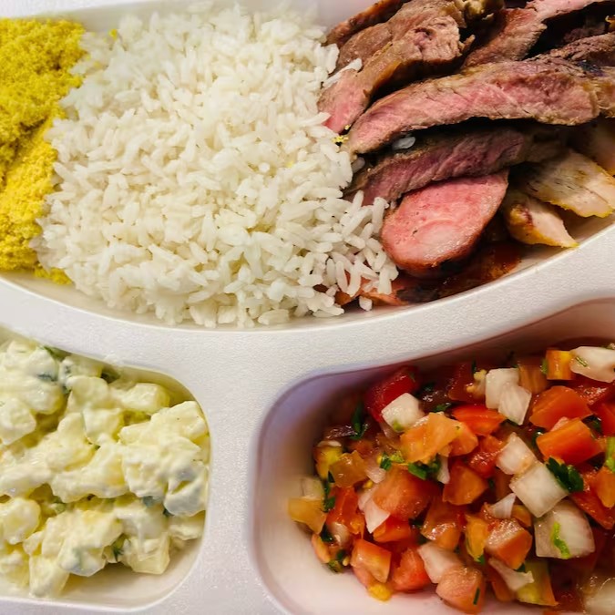 Este prato vai com um pedaço de (carne, filé de frango e 1 linguiça). Acompanhado de arroz, farofa, maionese e vinagrete.