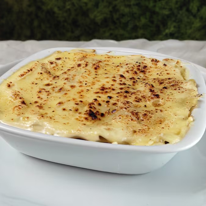 Massa de lasanha, frango desfiado, molho branco, molho de tomate caseiro, mussarela e queijo ralado