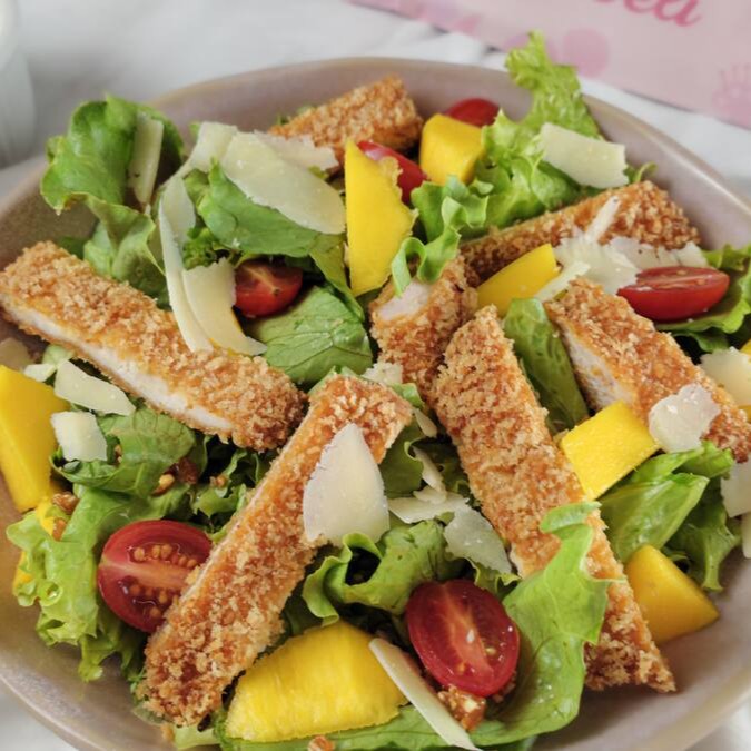Salada com alface, tomate cereja, manga refrescante com amendoins caramelizados (opcional), acompanhados de um molho que pode ser o de mostarda, mel e laranja ou cítrico deli (contém creme de leite) | escolha a proteína de sua preferência