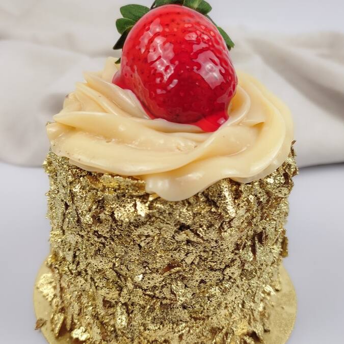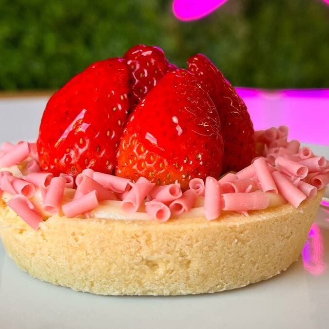 Mono porção com massa amanteigada branca, recheio galak, geleia de frutas vermelhas, chantininho, massa folhada Callebaut e morango fresco