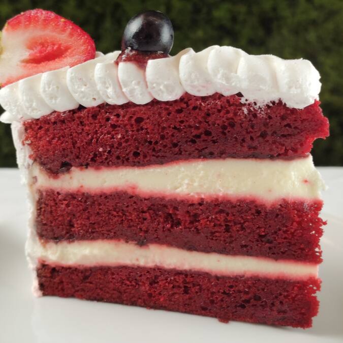 Fatia de massa red velvet, recheio a base de cream cheese, geleia de frutas vermelhas, chantininho, uva e morango fresco