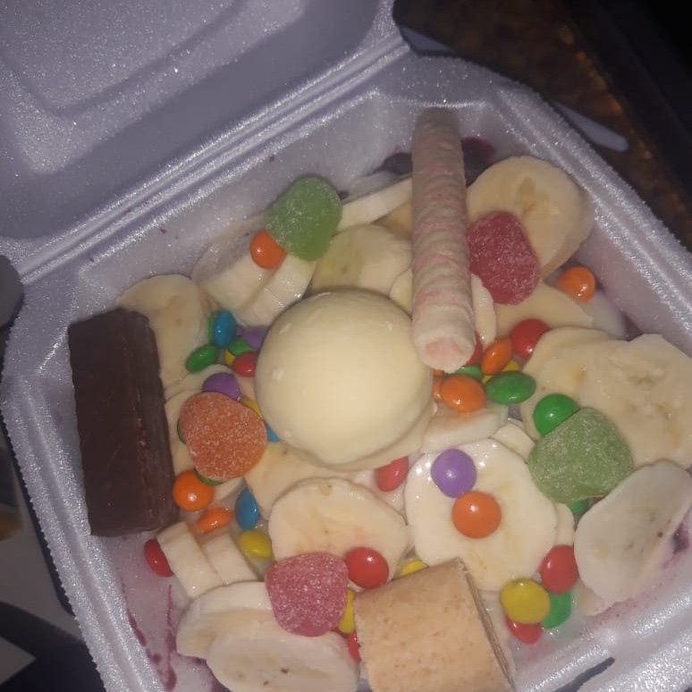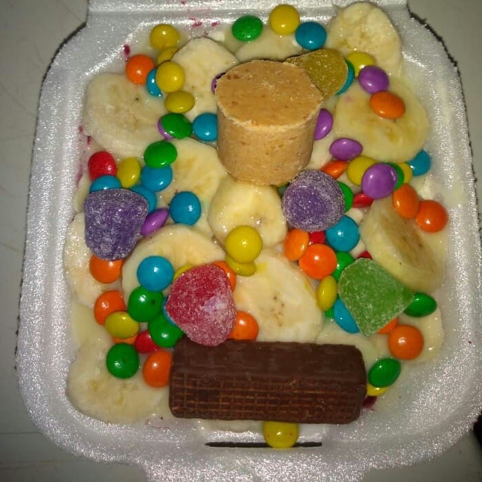 Granola, leite em pó, banana, leite condensado paçoca , mim, jujuba, Bis